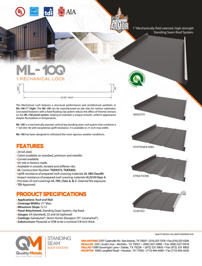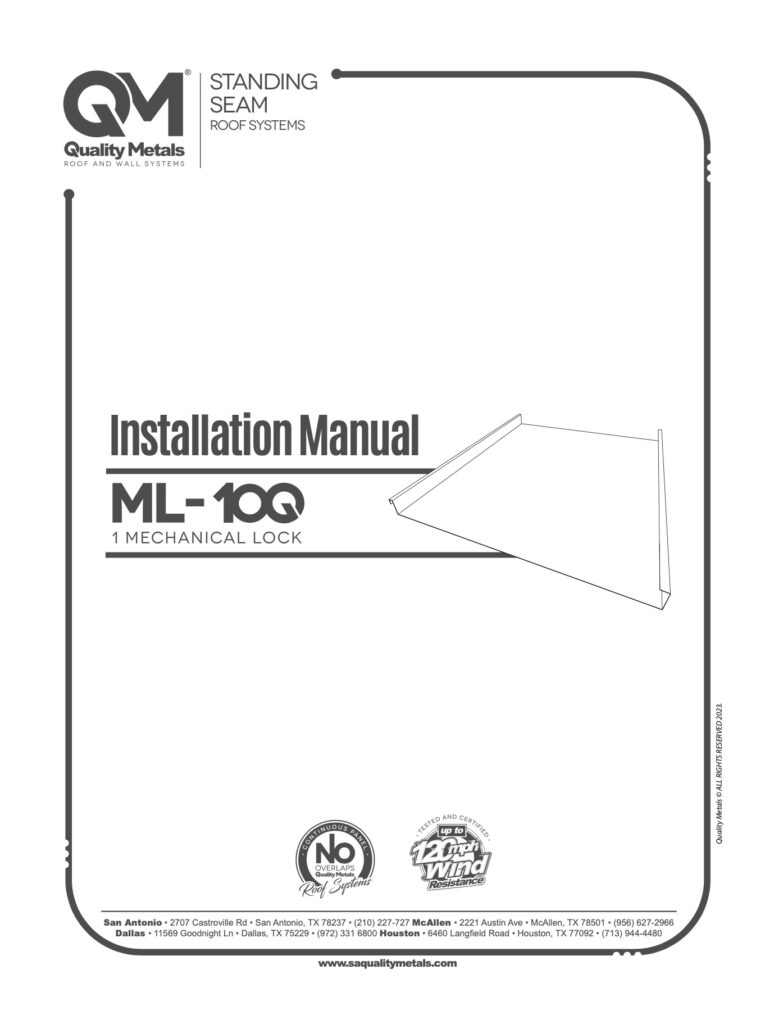 This manual contains suggestions and guidelines on how to install the subject Quality Metals ML-100 panel and trim details. The contents of this manual include the guidelines that were in effect at the time this publication was originally printed. In an effort to keep pace with the ever-changing code environment, Quality Metals retains the right to change specifications and/or designs at any time without incurring any obligations. To ensure you have the latest information available, please inquire or visit our website. Application and design details are for illustrative purposes only and may not be appropriate for all environmental conditions and/or building designs. Projects should be engineered and installed to conform to applicable building codes, regulations, and accepted industry practices.
