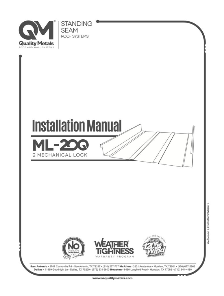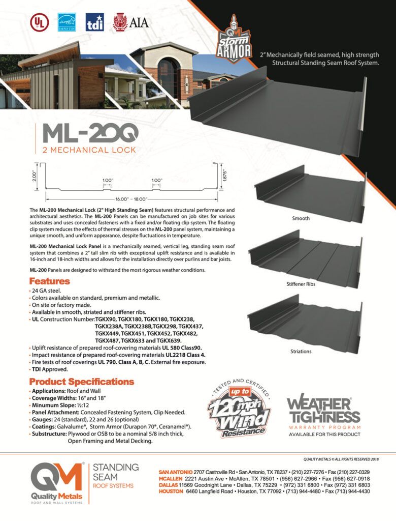 The ML-200 Mechanical Lock (2″ High Standing Seam) features structural performance and architectural aesthetics. The ML-200 Panels can be manufactured on job sites for various substrates and uses concealed fasteners with a fixed and/or floating clip system. The floating clip system reduces the effects of thermal stresses on the ML-200 panel system, maintaining a unique, smooth, and uniform appearance, despite fluctuations in temperature.