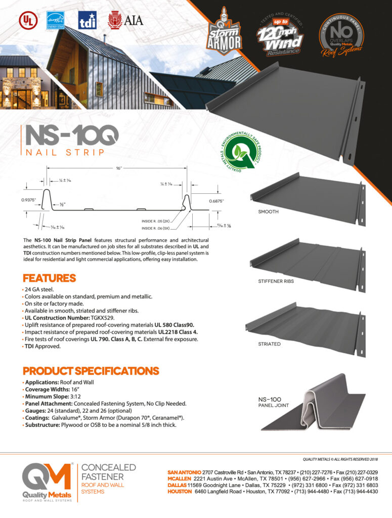 The NS-100 Nail Strip Panel features structural performance and architectural aesthetics. It can be manufactured on job sites for all substrates described in UL and TDI construction numbers mentioned below. This low-profile, clip-less panel system is ideal for residential and light commercial applications, offering easy installation