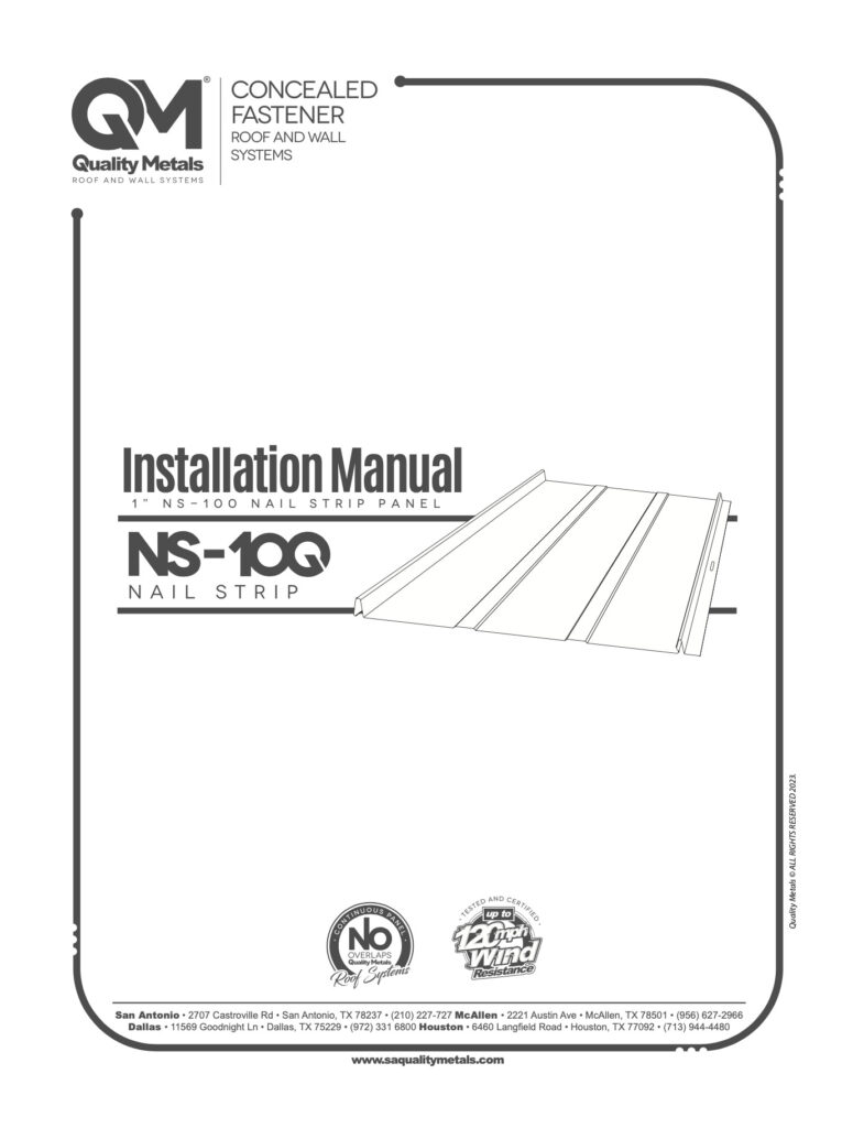 This manual contains suggestions and guidelines on how to install the NS-100 nail strip panel and trim details manufactured by Quality Metals. The contents of this manual reflect the guidelines in effect at the time of its original publication. Quality Metals reserves the right to modify specifications and/or designs without obligation, in response to evolving code requirements. To ensure access to the latest information, please consult our website or contact us directly.
